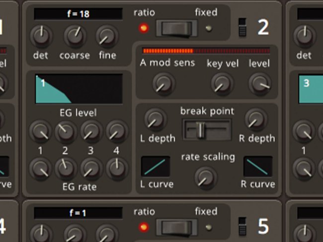 En haut à gauche de chaque panneau d'opérateur, il y a un affichage qui indique par défaut "F = 1". Cela indique le rapport entre la fréquence et la note fondamentale. Ainsi, si vous jouez un A3 de 440 Hz, F = 1 sera de 440 Hz, F = 2 sera de 880 Hz, F = 3 sera de 1320 Hz et ainsi de suite. Nous pouvons modifier la valeur entière de F à l'aide du bouton ‘Grossier’ (Coarse knob), effectuer des réglages plus fins à l'aide du bouton ‘Fin’ (Fine knob) et décaler d'un certain nombre de Hertz à l'aide du bouton ‘Désaccorder’ (Detune knob).