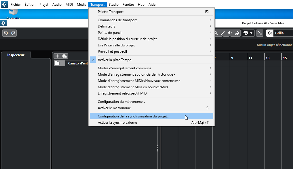 OK, donc nous sommes tous là, j'ai choisi mes instruments, et je veux m'assurer que, puisque j'utilise un arpège, le tempo que j'ai sélectionné dans Cubase soit envoyé au Montage ; de cette façon, il comptera le temps du musicien, nous parlons du temps du musicien ; donc sous le menu Transport, tout en bas , vous verrez "Project Synchronisation Setup" ("Configuration de la synchronisation du projet" pour Cubase 12 en français) : dans ce menu, vous pourrez choisir "Internal Timecode" comme source du Timecode ; plus bas vous pouvez régler la sortie de l'horloge midi :